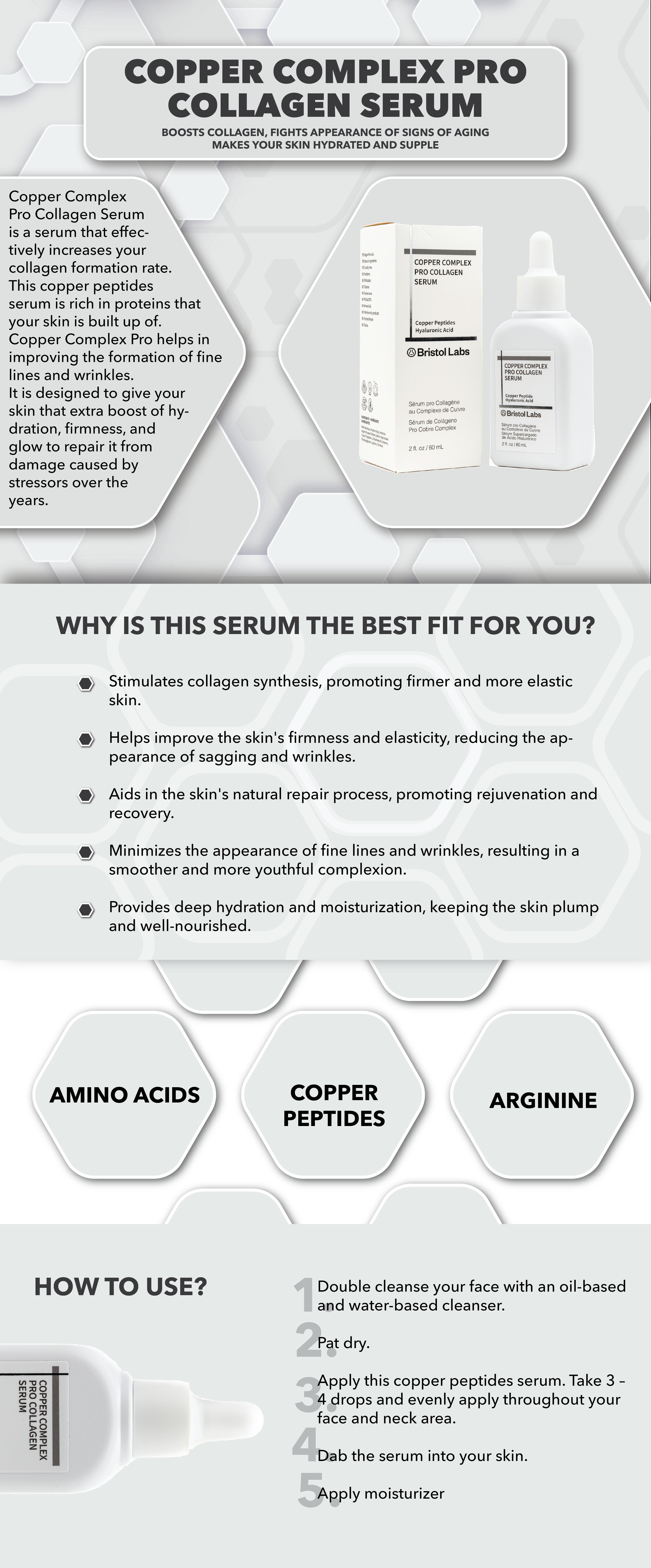 Copper Complex Pro Collagen Serum is a serum that effectively increases your collagen formation rate. This copper peptides serum is rich in proteins that your skin is built up of. Copper Complex Pro helps in improving the formation of fine lines and wrinkles. It is designed to give your skin that extra boost of hydration, firmness, and glow to repair it from damage caused by stressors over the years.