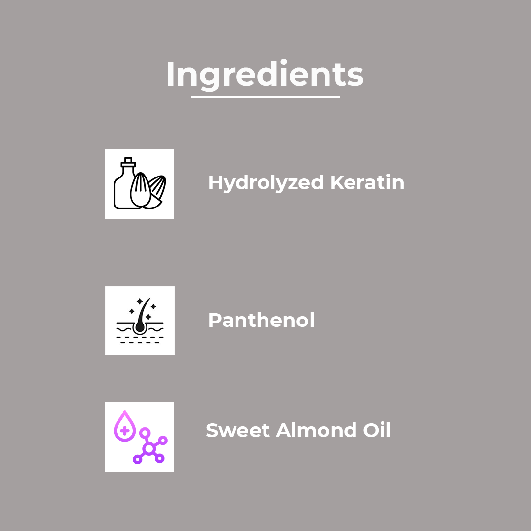 • Hydrolyzed Keratin – Strengthens hair by filling in gaps in the hair cuticles.